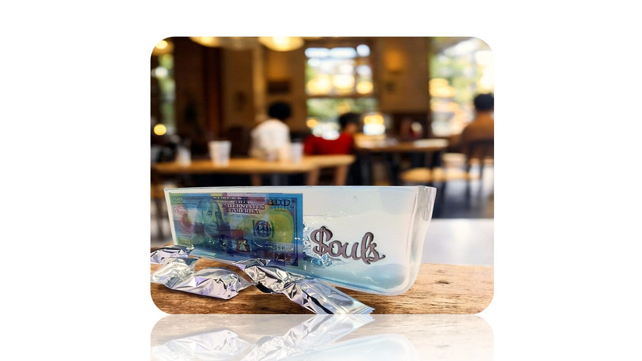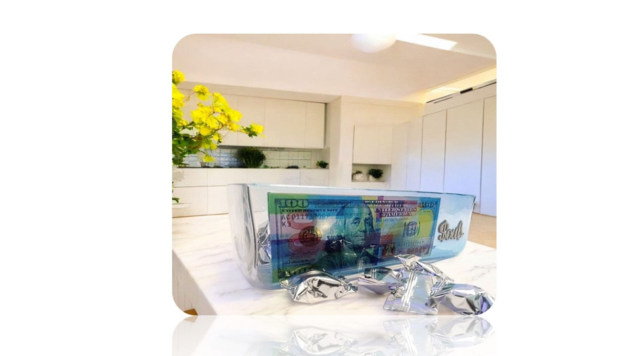 Gorgeous blown glass Candy Dish. 9x3x3 Candy Dish, with replica $100 bill. Birch laser cut $ouls logo in crystal clear blue laminate. Very sleek simplistic modern take on the ever popular Candy Dish decor motif.